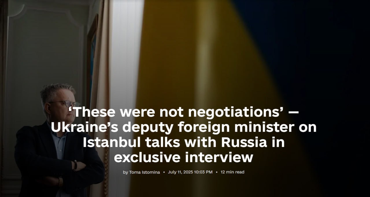 «Мандат Путіна (на стамбульських переговорах, – ред.) – змусити до капітуляції. Їхня логіка протилежна нашій. Ми говоримо: нумо встановімо припинення вогню як внесок у створення умов для зустрічі лідерів, у створення конструктивного середовища, яке сприятиме досягненню домовленостей. Вони відкрито заявляють: «Ні, спочатку ви приймаєте наші вимоги – капітуляцію – і лише потім ми організовуємо зустріч лідерів. А після цього ви будете займатися реалізацією цих вимог», – сказав Кислиця.