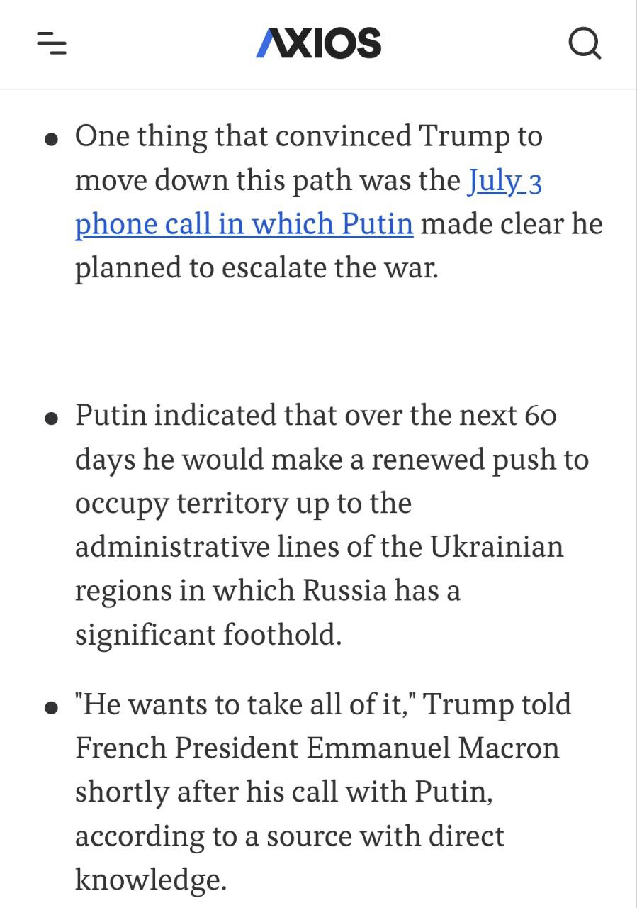 За даними джерел, такими деталями розмови поділився сам Трамп у приватній бесіді з президентом Франції Макроном.