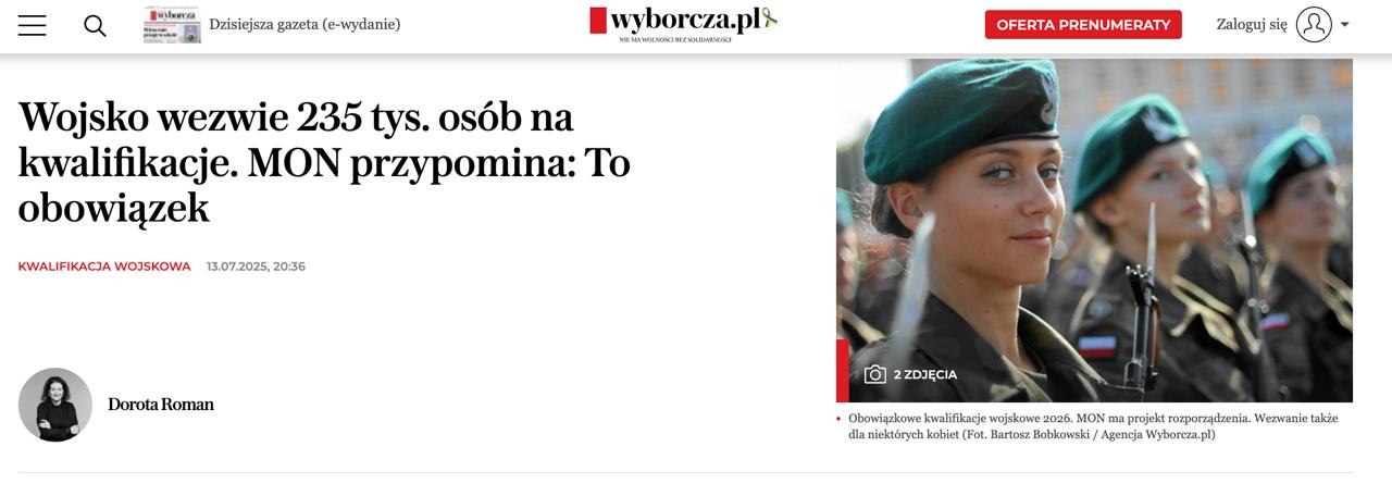 У Польщі близько 235 тисяч громадян на початку наступного року отримають повістки на військову медкомісію, повідомляє Gazeta Wyborcza.