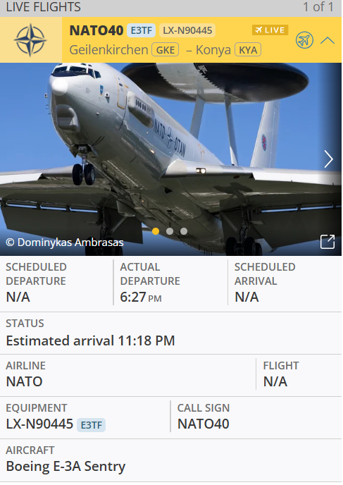 Це був американський літак далекого радіолокаційного виявлення Boeing E-3A Sentry. Маршрут рейсу пролягав від німецького міста Ґайленкірхен до турецької Коньї.