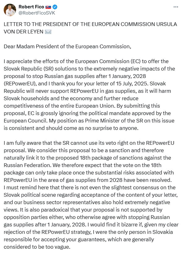 Прем’єр-міністр Словаччини Роберт Фіцо в середу надіслав листа голові Єврокомісії Урсулі фон дер Ляєн, у якому заявив, що продовжить блокувати ухвалення 18-го пакету санкцій щодо Москви, допоки не отримає більш конкретних гарантій щодо плану ЄС відмовитися від російського газу після 2028 року.
