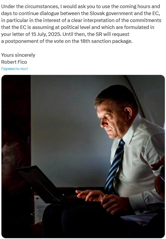«Прошу вас використати найближчі години та дні для продовження діалогу ЄС з урядом Словаччини... І поки питання не буде вирішено, Словаччина просить відкласти голосування щодо 18-го пакету санкцій», – йдеться в листі, текст якого Фіцо опублікував у X.