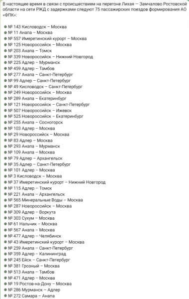 Станом на вечір повідомляється, що 75 поїздів прямують із затримками. Серед них, зокрема, ті, які слідують на південь Росії.