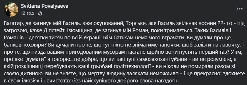 “Богатир, де загинув мій Василь, вже окупований, Торське, яке Василь звільняв восени 2022 — під загрозою, каже Діпстейт. Ізюмщина, де загинув мій Роман, поки тримається. Таких Василів і Романів десятки тисяч по всій Україні. Їхнім батькам нема чого втрачати. Ви думали про це, банкові козляри?” — написала Поваляєва.