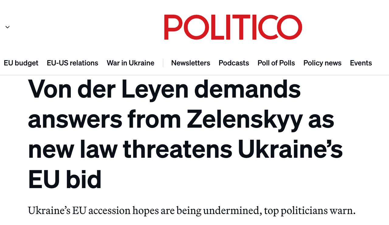 Глава Єврокомісії Урсула фон дер Ляєн висловила «серйозну стурбованість» ситуацією з НАБУ. Представник Європейської Комісії заявив, що «компроміс з цього питання неможливий».