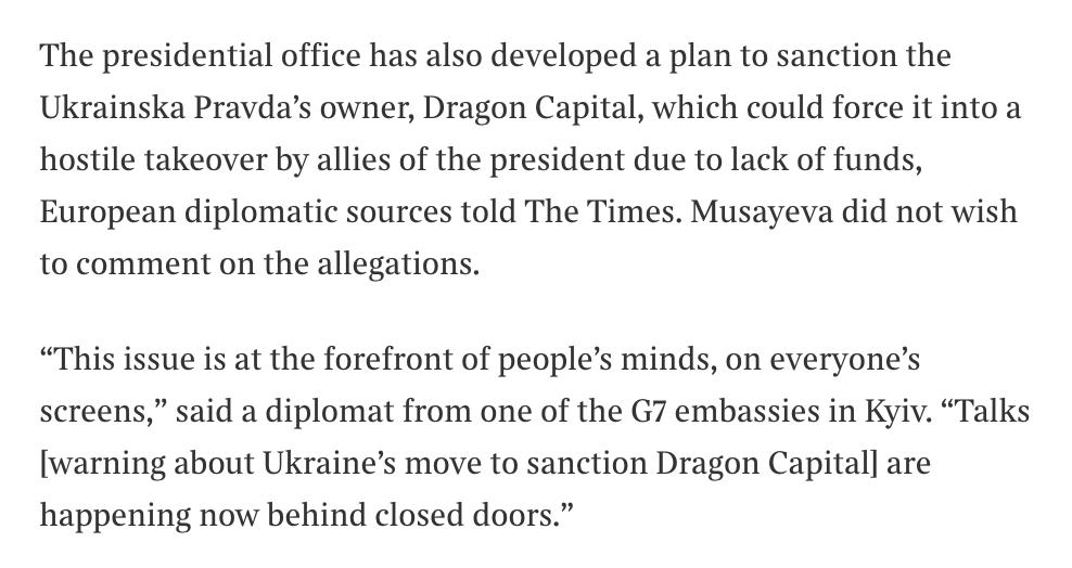 За даними Times із посиланням на європейських дипломатів, санкції мають торкнутися Dragon Capital. Це рішення пов’язують зі скандалом навколо віцепрем’єра Чернишова, який активно висвітлювався в «Українській правді». Наприкінці червня Зеленський запровадив санкції проти бізнес-партнера Фіали, що стало, за версією ЗМІ, «останнім попередженням» і самому власнику видання.