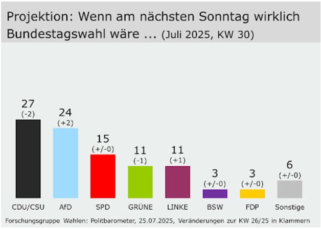 Рейтинги інших німецьких партій в опитуванні Politbarometer практично не змінилися: Соціал-демократична партія з 15% посідає третє місце, далі – Партія зелених і "Ліві" з 11% кожна.