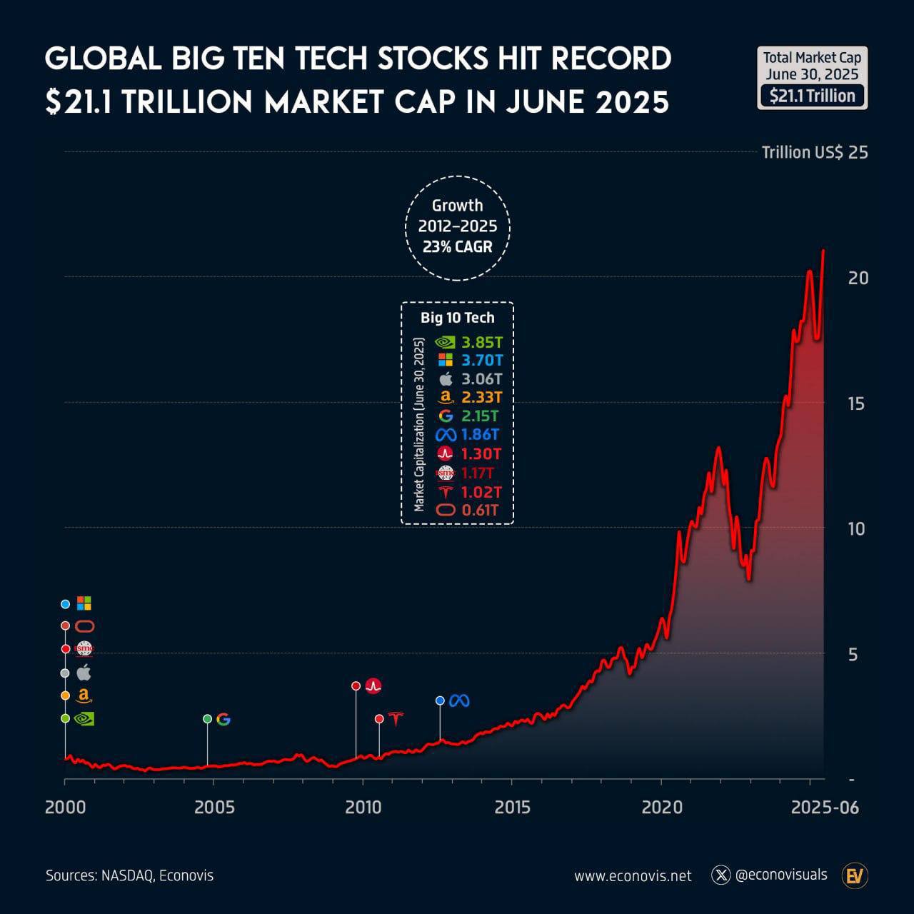 Станом на зараз сумарна ринкова капіталізація десяти провідних світових технологічних гігантів — Alphabet, Amazon, Apple, Broadcom, Meta, Microsoft, Nvidia, Oracle, Tesla та TSMC — досягла рекордних $21,1 трильйона.