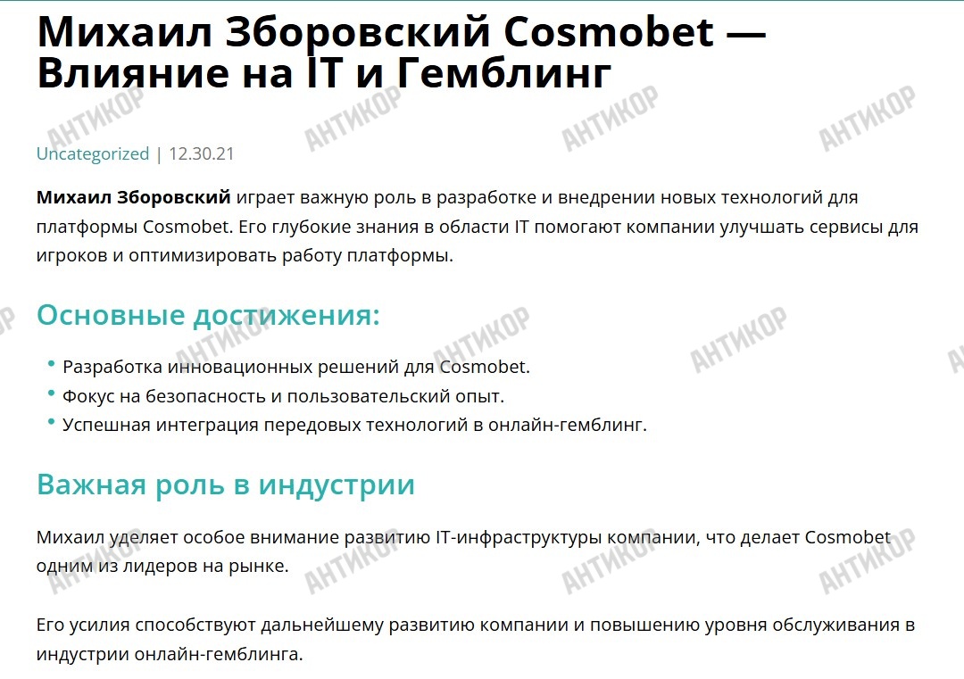 Так на сцені й з’явився Михайло Зборовський. Але документи, свідчення і структура власності говорять про протилежне: Cosmobet — не нова платформа, а продовження старої схеми. Тільки з новим фасадом. Паралельно з запуском Cosmobet почалася інтенсивна медіакампанія з формування образу Зборовського. У Google почали масово з’являтися псевдоінтерв’ю на англомовних сайтах із сумнівним трафіком (BaronBlakeslee, TheComfortCenter); статті про «вплив Зборовського на ринок технологій»; фейкові аналітичні огляди про його «роль у цифровій трансформації азартних ігор». Все це — матеріали без конкретики, з однаковими формулюваннями, завантажені одночасно на сайти, що не мають відношення до українського IT або гемблінгу. Щобільше – деякі з них явно завантажені «заднім числом».