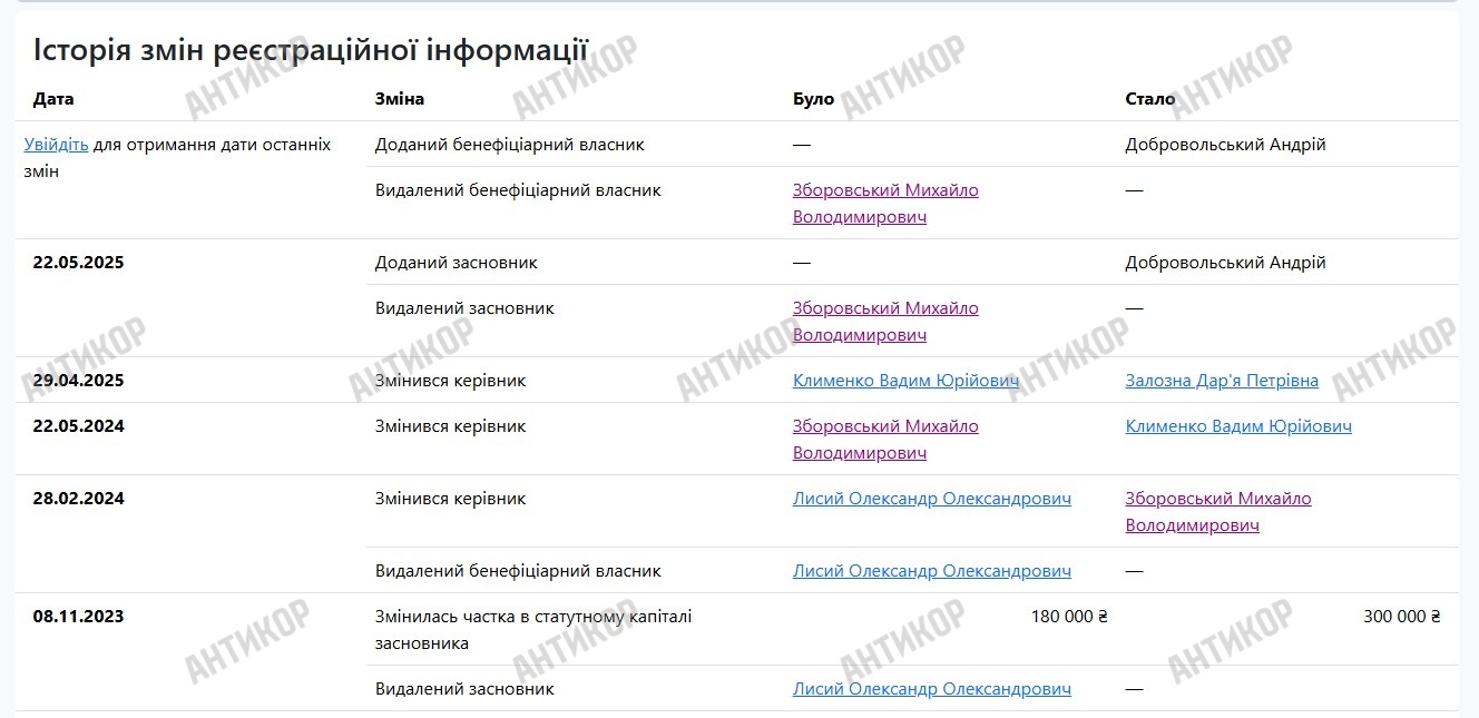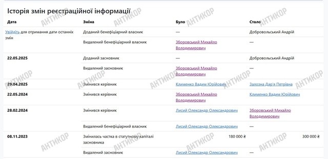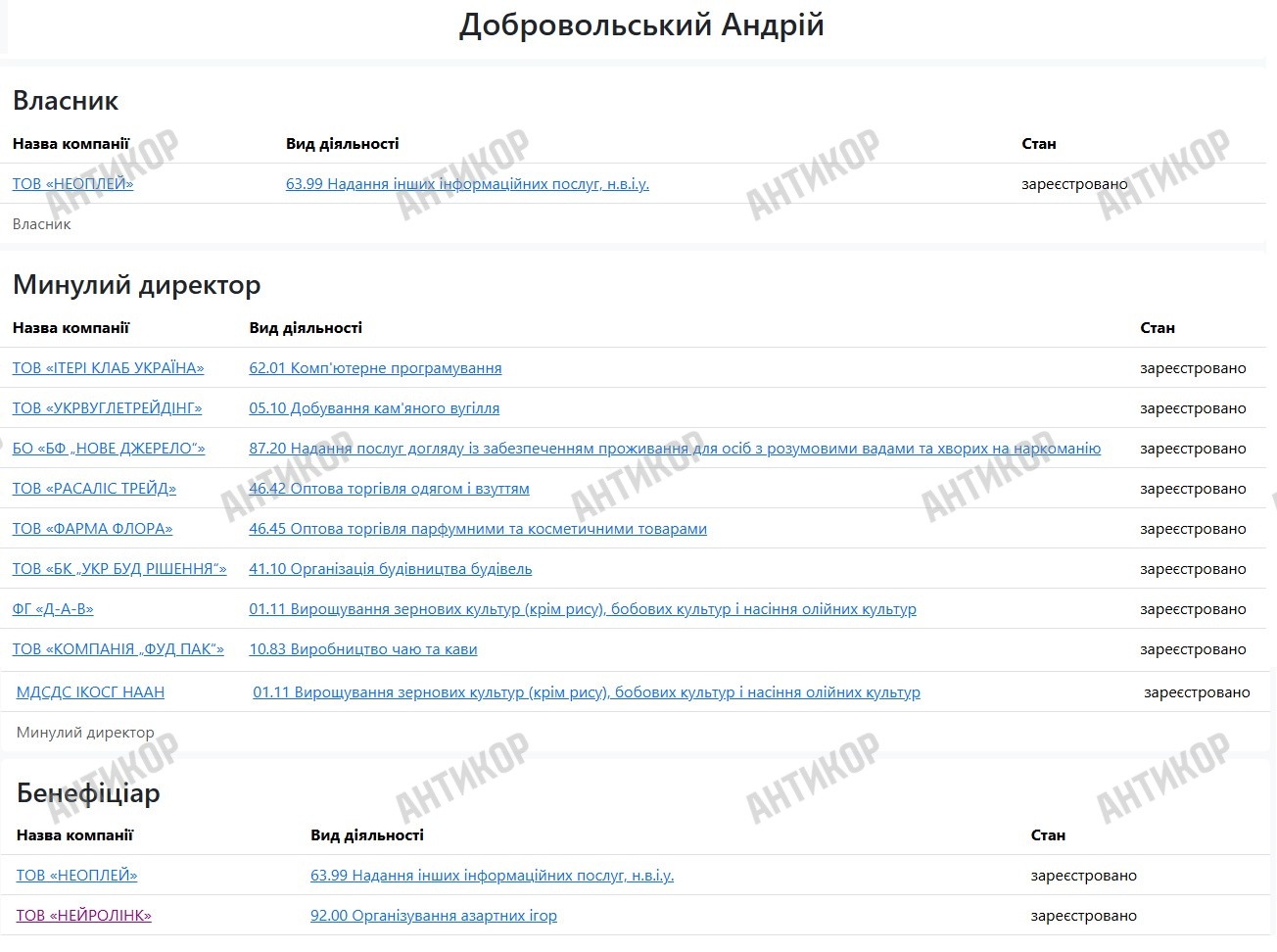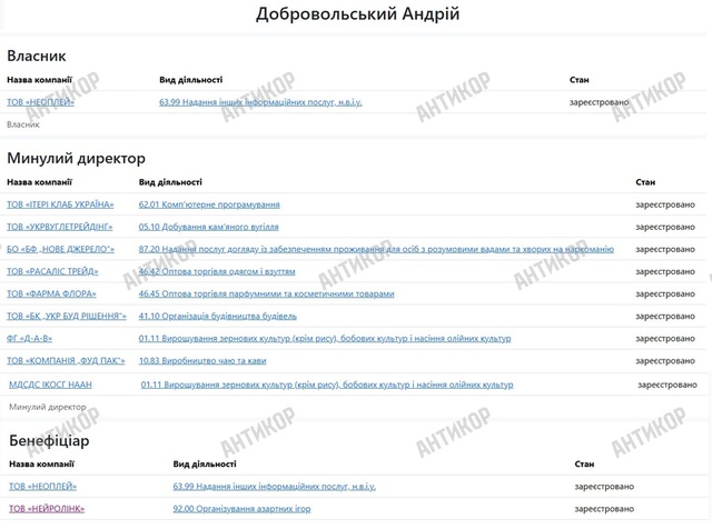 Це підтверджують реєстраційні дані ТОВ «Нейролінк» і ТОВ «Неоплей» - Михайло Зборовський виведений з бенефіціарів, а на його місце став громадянин Кіпру Андрій Добровольський.
