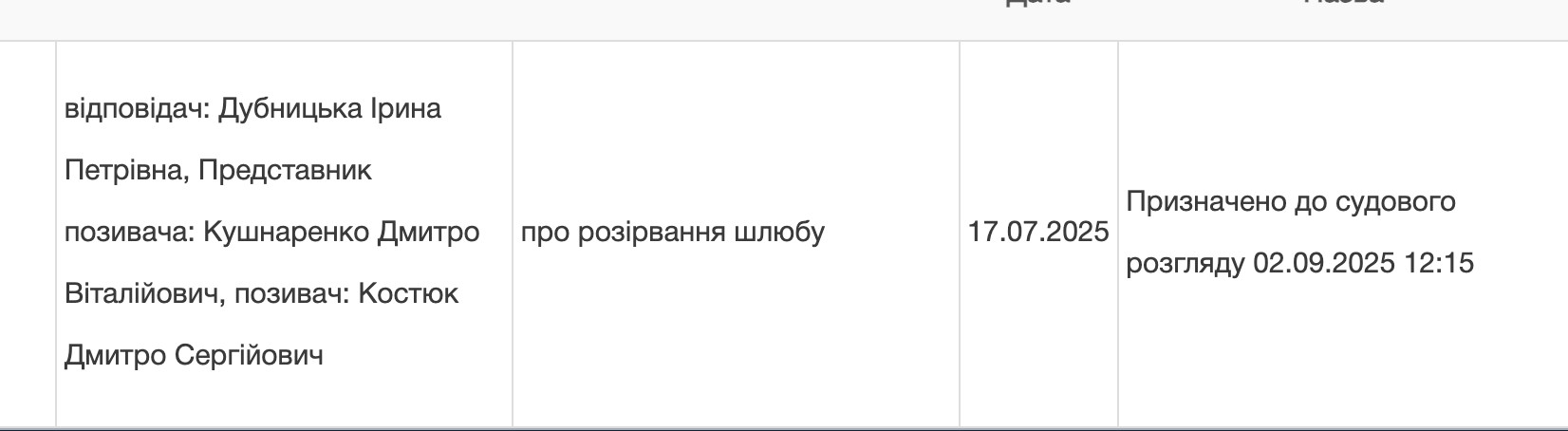 Костюк через адвоката Дмитра Кушнаренка ще в травні подав до Дніпровського районного суду позов про розірвання шлюбу. Справу розглянуть у вересні.