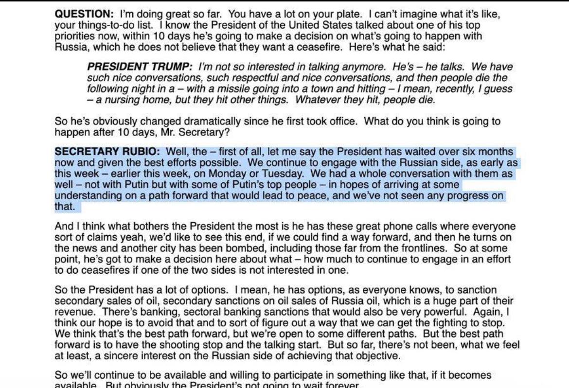 Він охарактеризував розмову як «закриту», наголосивши, що американська сторона прагнула «знайти спільне розуміння шляхів, які б привели до миру», але не побачила «жодного прогресу». При цьому Рубіо не розкривав деталей переговорів.