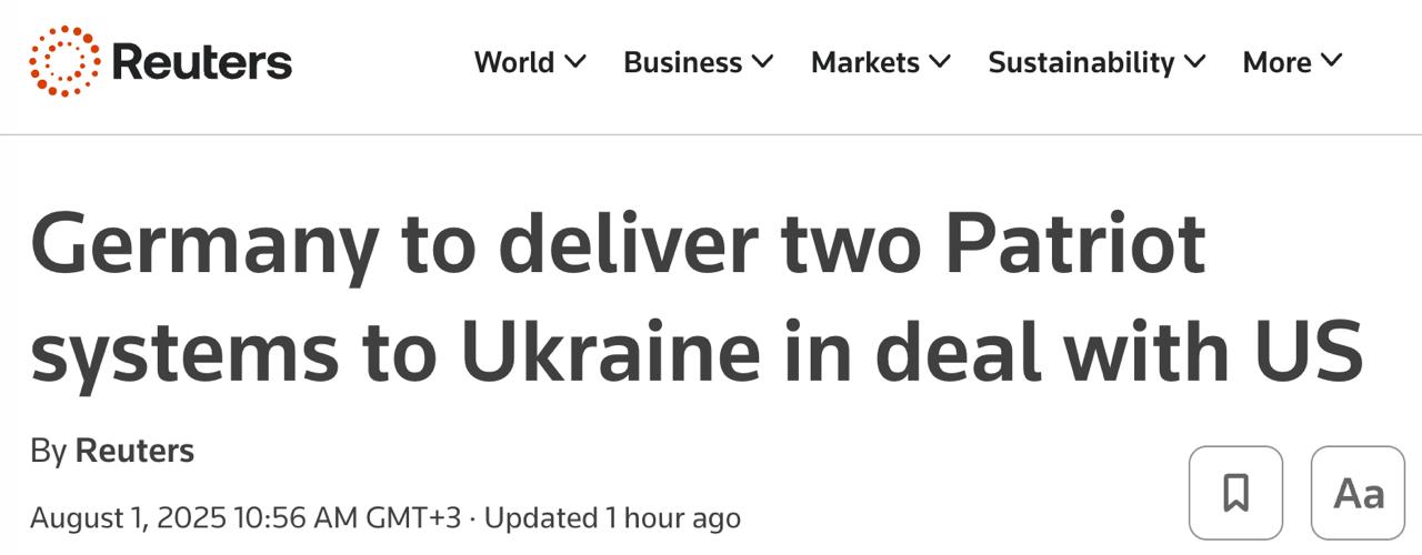 Німеччина вже "найближчими днями" передасть Україні нові пускові установки Patriot, а потім через два-три місяці — додаткові комплектуючі до них.