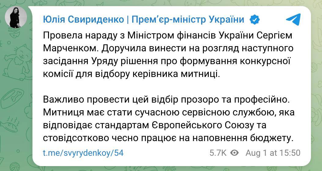 «Доручила винести на розгляд наступного засідання уряду рішення про формування конкурсної комісії для відбору керівника митниці», — зазначила Свириденко.