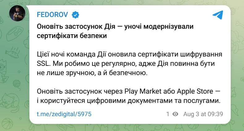 Перший віцепрем’єр - міністр цифрової трансформації Михайло Федоров порадив користувачам оновити застосунок "Дія", оскільки вночі модернізували сертифікати безпеки.