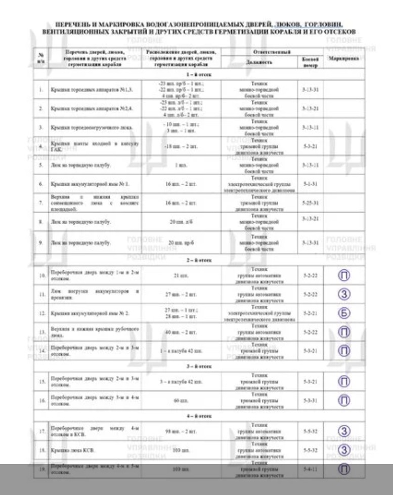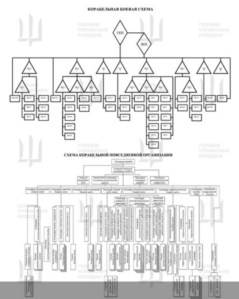- бойова схема корабля, схеми систем забезпечення живучості та організаційної структури екіпажу;