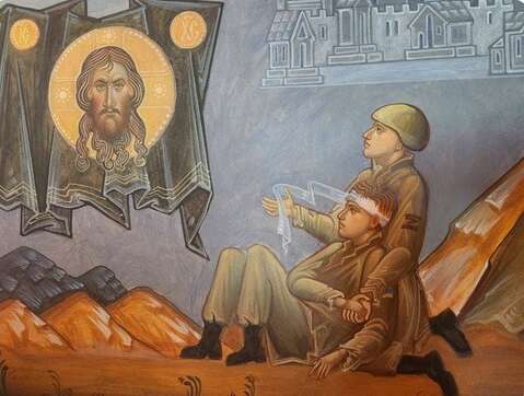 Російські пропагандисти акцентували на тому, що тут навіть є фреска із зображенням російського солдата, який під час війни в Україні перев’язує рани солдату ЗСУ.