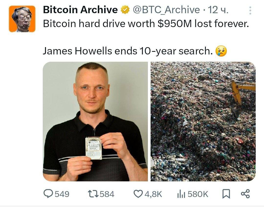 Джеймс Хауеллс, житель Ньюпорта (Велика Британія), після 12 років спроб припинив пошуки жорсткого диска, на якому, за його словами, зберігалося 7500 біткоїнів.