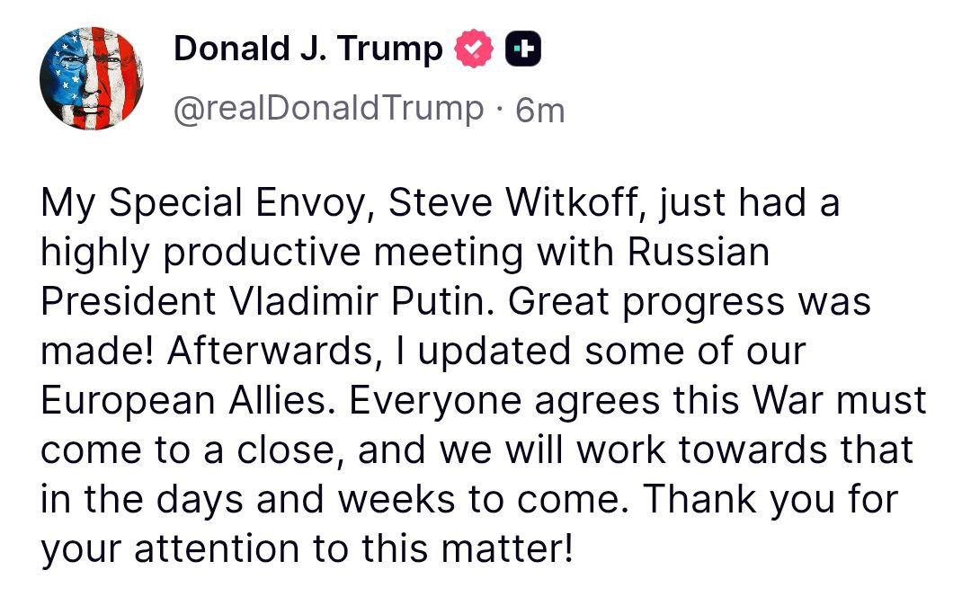 "Мій спеціальний посланець Стів Віткофф щойно провів дуже продуктивну зустріч із президентом Росії Володимиром Путіним. Досягнуто значного поступу!" - запевнив Трамп.