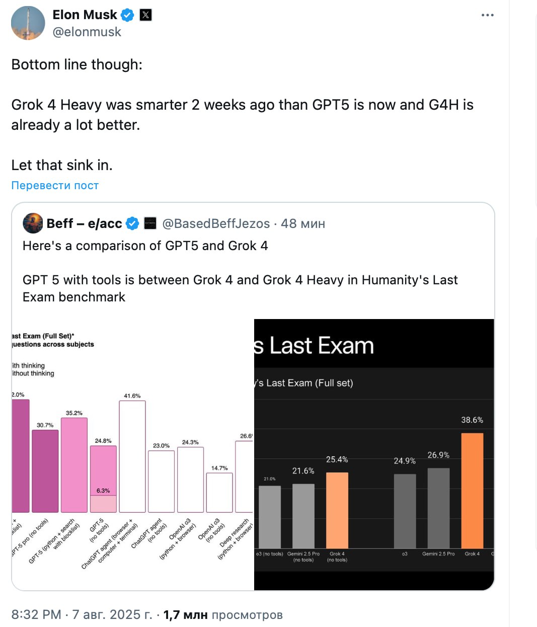 Ілон Маск заявив, що модель штучного інтелекту Grok 4 Heavy два тижні тому була розумнішою за нинішній GPT-5 і вже значно перевершує його за якістю.