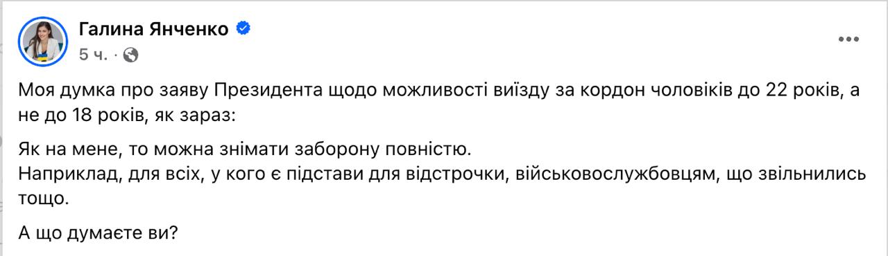Нардепка від «Слуги народу» Галина Янченко пропонує дозволити виїзд за кордон усім чоловікам з відстрочкою від військової служби.