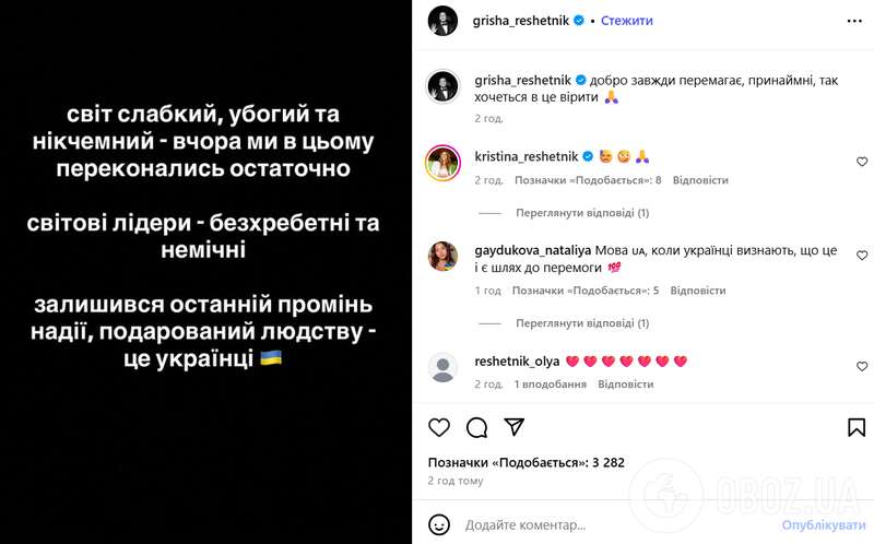 Дуже різко про зустріч політиків на Алясці висловився і шоумен Григорій Решетнік: "Світ слабкий, убогий і нікчемний. Учора ми в цьому переконалися остаточно. Світові лідери – безхребетні та немічні. Залишився останній промінь надії, подарований людству, – це Україна".