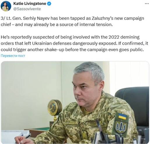 Як вона стверджує, керівником виборчого штабу Залужного призначено генерал-лейтенанта Сергія Наєва.