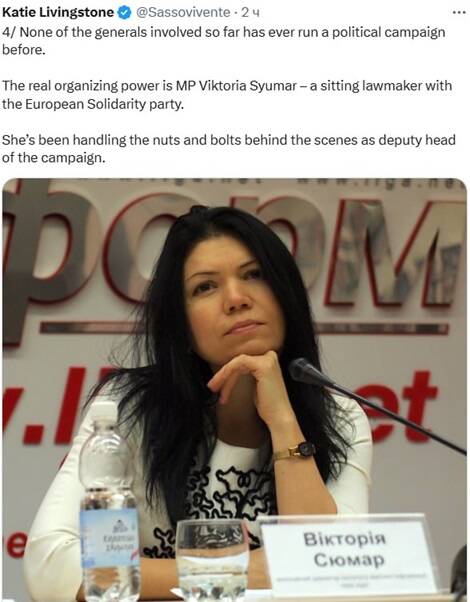 Фактичним організатором політичної кампанії Залужного стала народна депутатка від партії Петра Порошенка "Європейська солідарність" Вікторія Сюмар. Вона відповідає за всі деталі в ролі заступника керівника кампанії, додає журналістка.