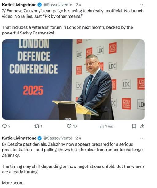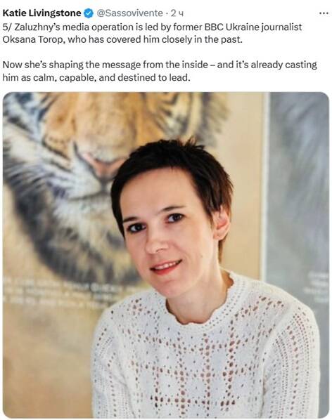 За даними Лівінгстон, медійну підтримку кампанії довірили колишній журналістці української редакції Бі-Бі-Сі, Оксані Тороп, яка раніше активно висвітлювала роботу Залужного на посаді головкома ЗСУ.