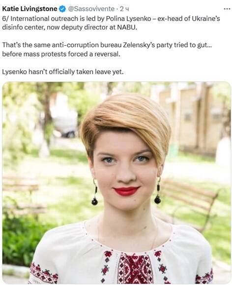Міжнародну діяльність очолює Поліна Лисенко – екскерівник українського центру по боротьбі з дезінформацією, а нині заступник директора НАБУ.