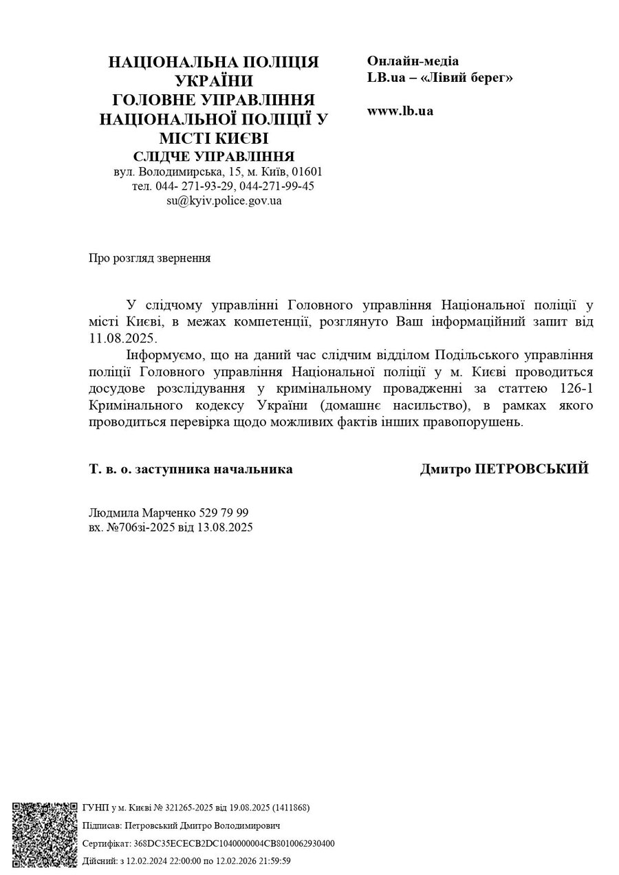 Журналісти видання LB.ua поцікавилися у правоохоронців, чи було розпочато кримінальне провадження щодо актора Театру на Подолі Костянтина Темляка. Їм відповіли, що проводиться досудове розслідування за статтею 126-1 Кримінального кодексу України про домашнє насильство. Про це видання повідомило 19 серпня.
