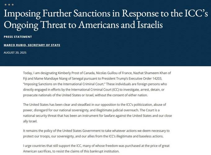 Державний секретар США Марко Рубіо оголосив про додавання до санкційного списку чотирьох суддів Міжнародного кримінального суду – Кімберлі Прост (Канада), Ніколя Гію (Франція), Назхат Шамім Хан (Фіджі) і Маме Мандіайе Ніанга (Сенегал).