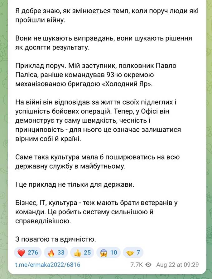 "Сьогодні я запропонував Президенту України провести реформу Офісу Президента. Основна ідея полягає в тому, щоб значну частину персоналу Офісу складали військові з підтвердженим досвідом участі у повномасштабній війні або ветерани бойових дій. Це стосується працівників усіх рівнів та відділів без винятку. Володимир Зеленський підтримав цю ініціативу", — пише голова Офісу Президента.