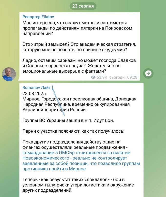 Ще жорсткіше висловився інший пропагандист Філатов. За його словами, неправдиві звіти стали нормою, це коштує російській армії дуже великих втрат. "Новоекономічне на карті шукайте самі. Нібито його звільнили, а звідти українці прийшли в Мирне. Просто вони не знали, що це місце вже «зачищене»", - написав Філатов.