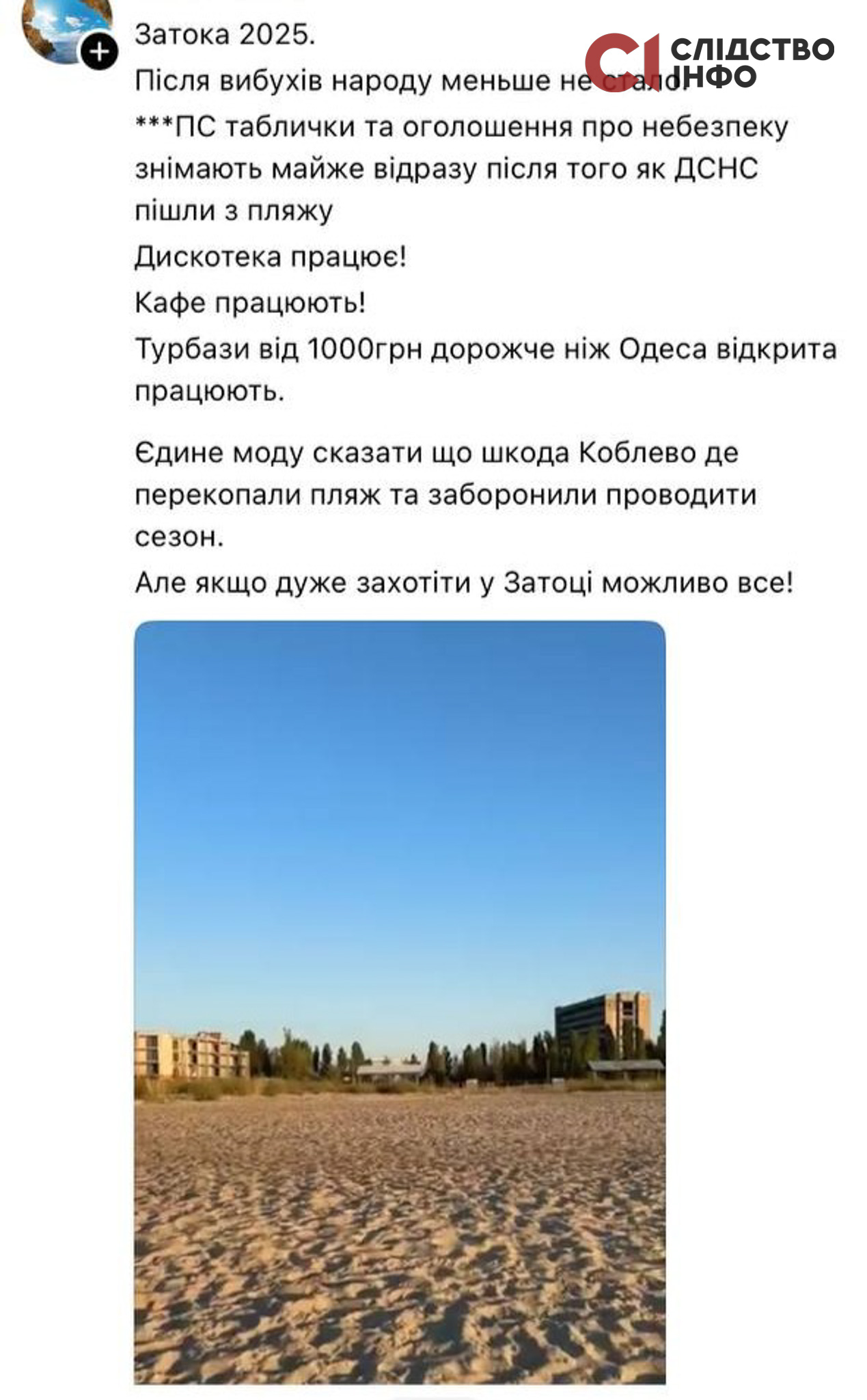 Затока — відомий курорт до повномасштабного вторгнення. Журналістка знайшла свідка, який був під час підриву тут туриста 10 серпня. Він надав фото оголошення, яке було розміщено на проході на пляж. Тож відпочивальники мали б бачити його.