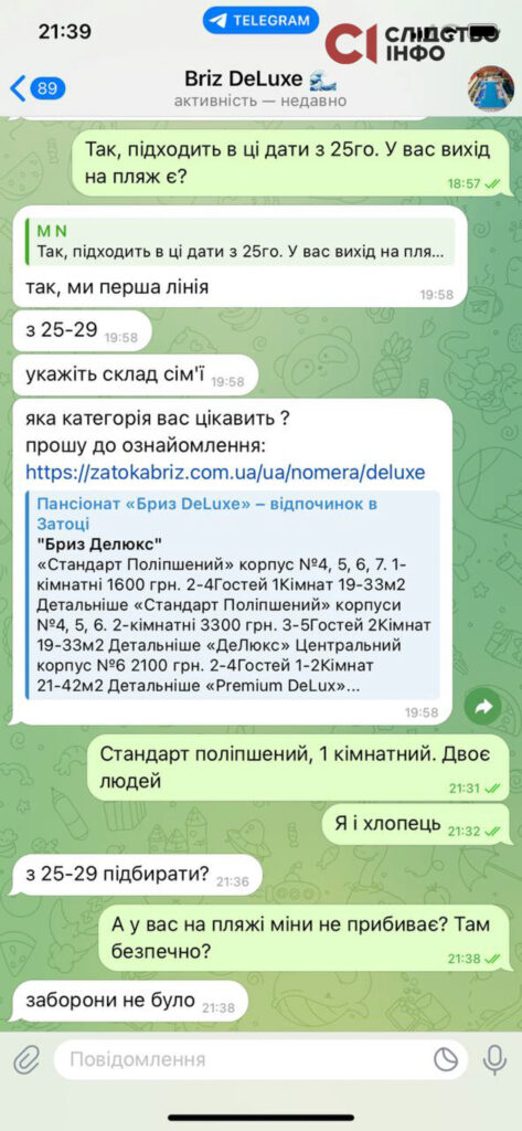 Готель «Briz de Luxe» теж вказав, що знаходиться на першій лінії від моря, але в промо майже всюди відпочинок у басейні. Саме в цьому готелі, як повідомив сільський голова Андрій Апанасенко, зупинився турист, який підірвався на міні в Затоці. Там попередження про мінну небезпеку залишалось.