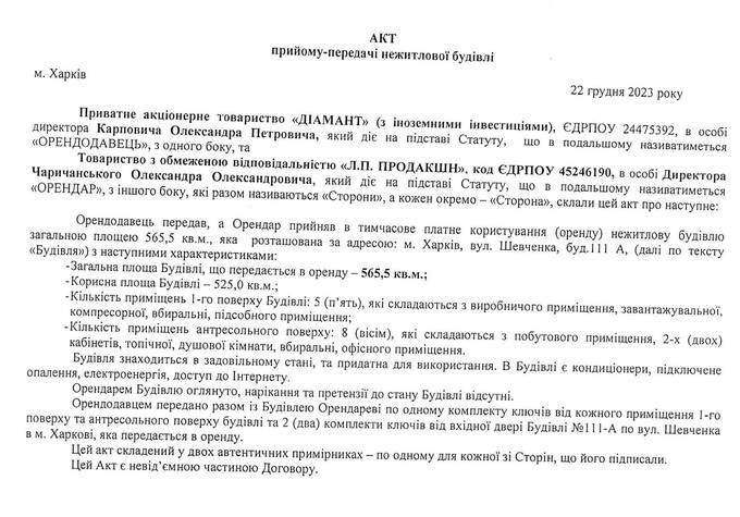 Власником майна є ПрАТ «Діамант» (з іноземними інвестиціями). Директором вказаний Золотухін Роман Олексійович. Нещодавно він був фактичним головою сервісного центру МВС № 6341 у Харкові та задекларував 510 тис. доларів при звільненні.