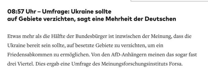 Відповідно до опитування, проведеного інститутом Forsa, 52% респондентів з Німеччини вважають, що Україна повинна поступитися територіями, захопленими Росією, заради досягнення миру.