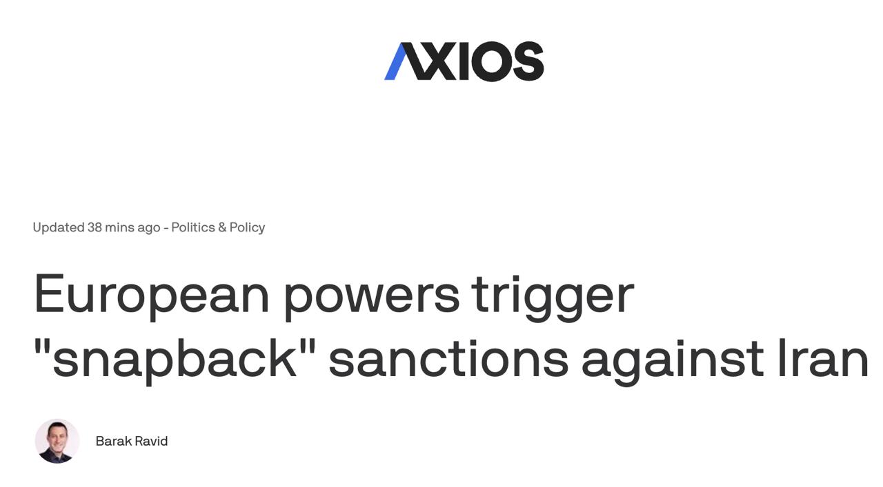 Європа планує протягом місяця повернути санкції ООН щодо Ірану, які були призупинені в результаті ядерної угоди 2015 року, якщо на переговорах не буде досягнуто прогресу.