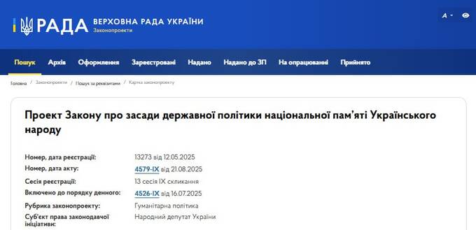 Ухвалений закон має стати інструментом протидії антиукраїнській пропаганді та консолідації суспільства довкола спільного розуміння минулого.
