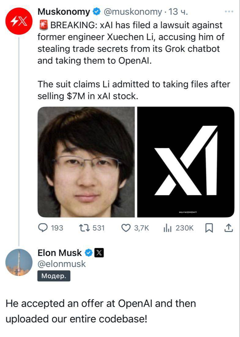 Колишній спеціаліст із компанії Ілона Маска, Сюечен Лі, викрав вихідний код чат-бота Grok, пішов з роботи та перейшов в OpenAI. Перед звільненням він також продав акції xAI на суму $7 млн.