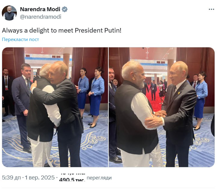 «Завжди приємно зустрічатися з президентом Путіним», – написав прем’єр після зустрічі з російським лідером перед початком саміту Шанхайської організації співробітництва (ШОС) у Тяньцзіні.