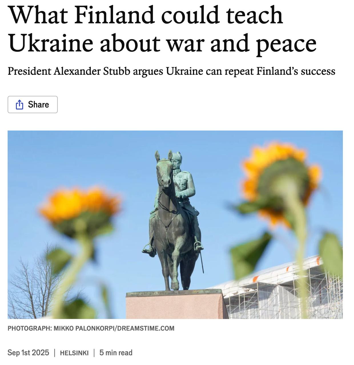 Видання згадує слова президента Фінляндії Стубба на недавній зустрічі з Трампом у Білому домі, де він заявив: «ми знайшли рішення в 1944 році, і я впевнений, що зможемо знайти рішення у 2025 році, щоб покласти край агресивній війні Росії та досягти сталого і справедливого миру».