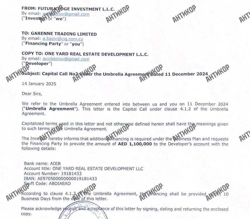 Саме в цей момент на сцені з’явились офіційні повідомлення інвесторів з вимогою внести нові суми. У розпорядженні редакції є такі листи від FUTURA EDGE INVESTMENT L.L.C. Один адресований самій Яні Рудковській, інший — компанії Garenne. У обох випадках йшлося про «необхідність профінансувати наступний етап проєкту».