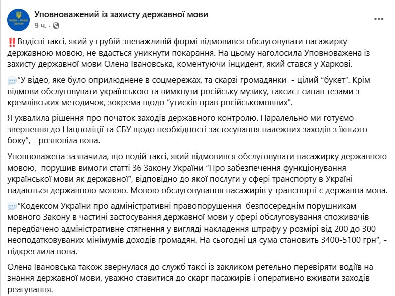 За словами уповноваженої із захисту державної мови Івановської, таксисти отримають штрафи за використання російської мови. Про це вона повідомила у фейсбуці.