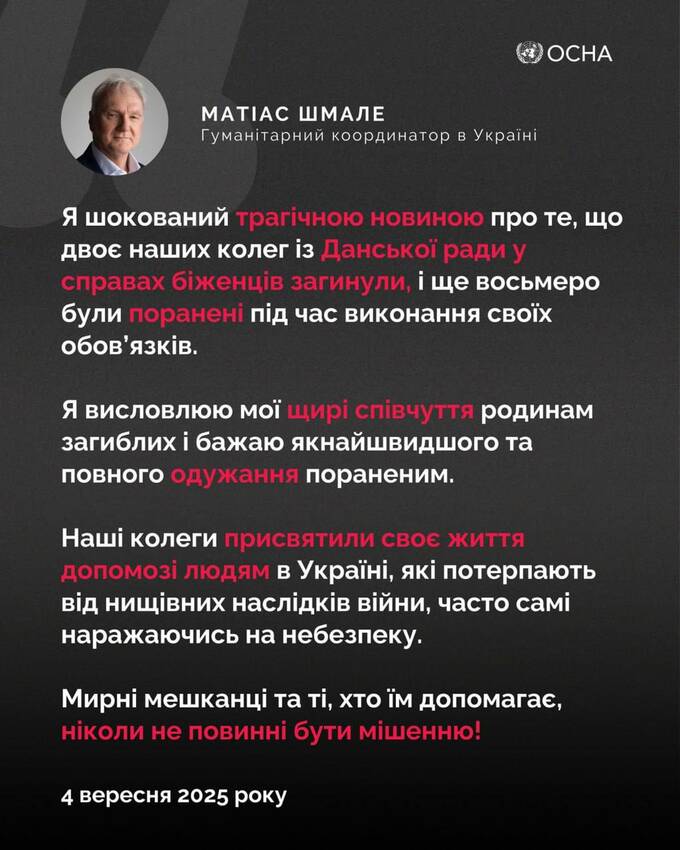 "Я вражений трагічною новиною про те, що два наших колеги з Данської ради у справах біженців загинули, і ще восьмеро були поранені під час виконання своїх обов’язків внаслідок сьогоднішнього удару Збройних сил РФ у Чернігівській області", - наголосив Шмале.