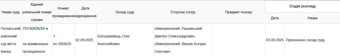 З даних випливає: 3 вересня 2025 року відбувся авторозподіл провадження, слухання якого випало судді Олегу Білоцерківцю. Окрім "Рашика", на лаві підсудних також опинився його приятель Богдан Віказін, дії якого кваліфіковані як хуліганство (ч.2 ст.296 КК України).