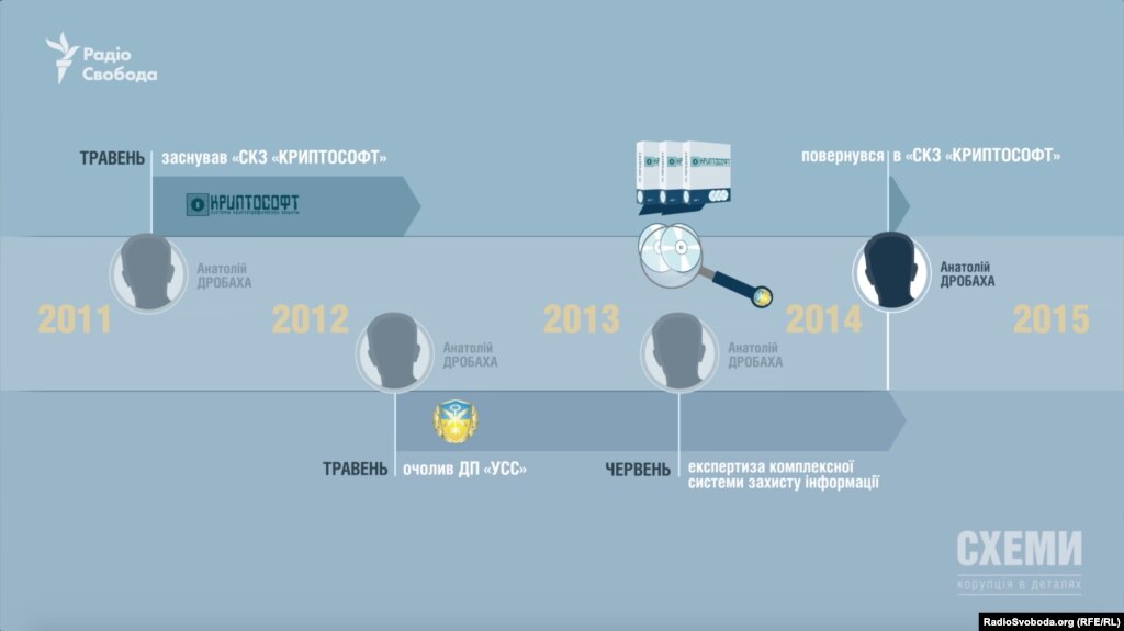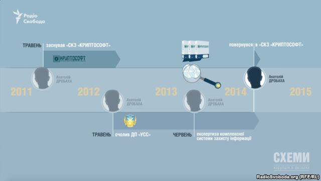 Засновником «Криптософту»у 2011 був Анатолій Іванович Дробаха. 14 травня 2012 року він стає директором державного IT-підприємства «Українські спеціальні системи». У червні 2013 року «Українські спеціальні системи» були призначені для проведення експертизи комплексної системи захисту, розробленої «Криптософтом». У 2014 Дробаха йде з посади гендиректора «Українських спеціальних систем» і повертається у «Криптософт».
