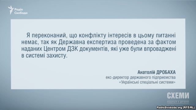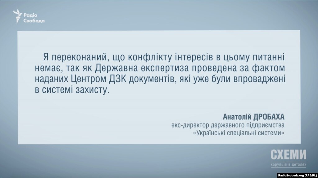 «Я переконаний, що конфлікту інтересів в цьому питанні немає, оскільки державна експертиза проведена за фактом наданих Центром державного земельного кадастру документів, які уже були впроваджені в системі захисту», – відповів листом екс-директор державного підприємства «Українські спеціальні системи» Анатолій Дробаха.