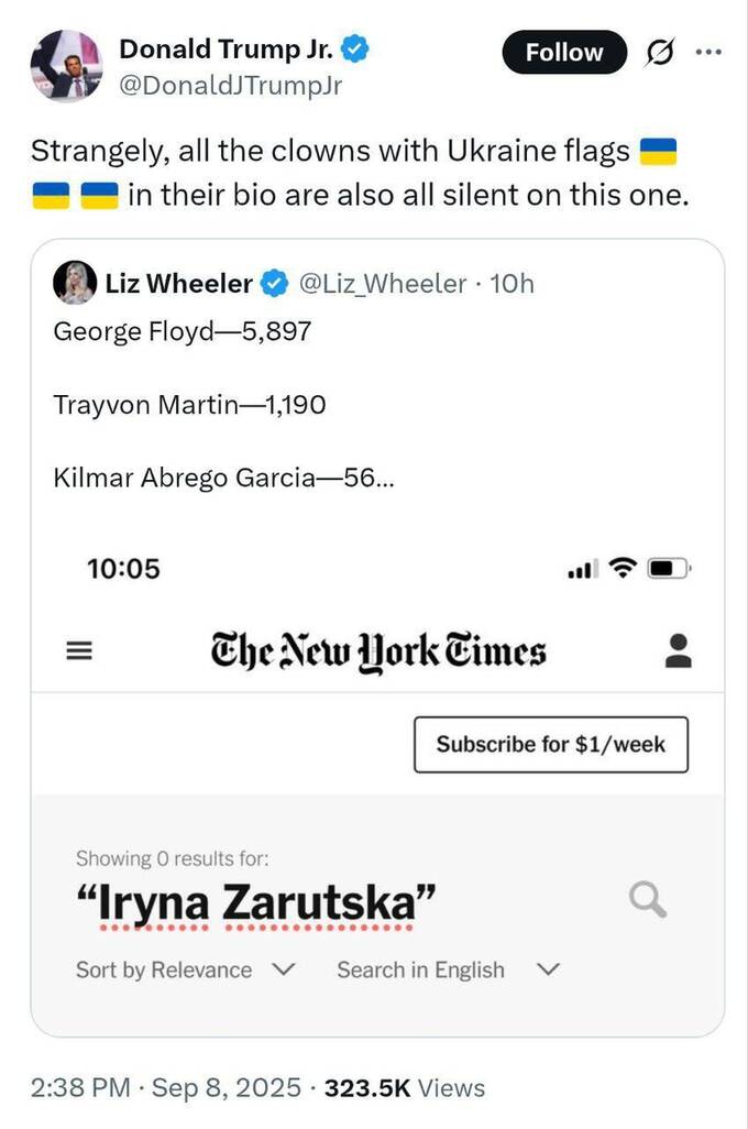Син Трампа звинуватив у приховуванні історії про вбивство українки афроамериканцем у США не лише медіа, що підтримують Демократичну партію, а й користувачів, які підтримують Україну.